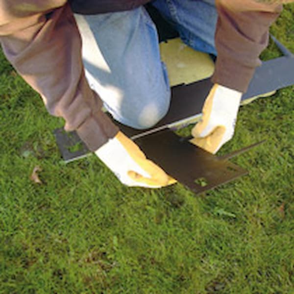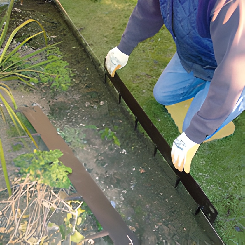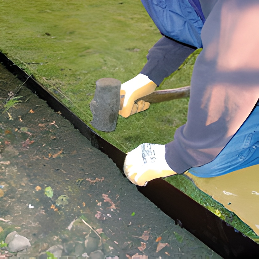 Gumikalapáccsal vagy hagyományos kalapács esetén deszkán kalapáljuk a földbe a szegélyt, amíg a szegély teteje a gyeppel egy szintbe nem kerül.